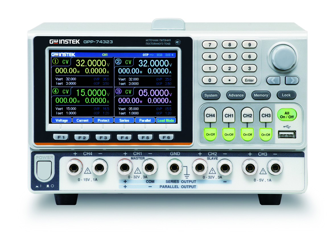 GPP-73323 | 0...32 В 0...3А | 0...32 В 0...3А | 1.8V/2.5V/3.3V/5V 5А | - | 0...64В 0...3 А | 0...32 В 0...6 А |
